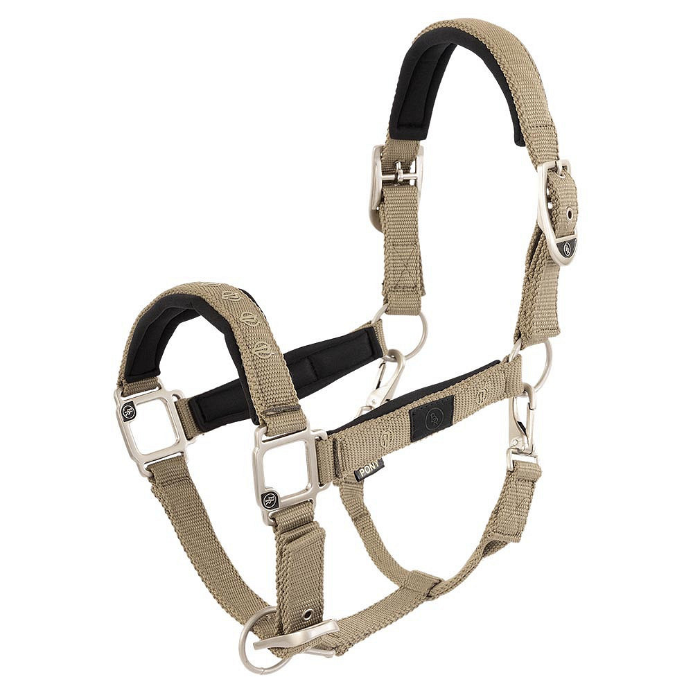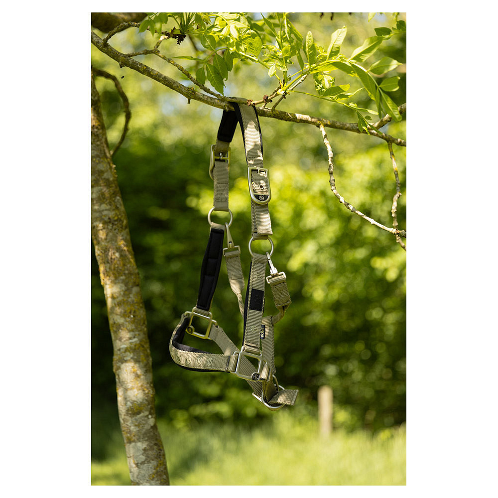 - Materiaal: Banden van polypropyleen, Voering: neopreen (kopstuk, neusriem en bakstukken), Hardware: mat zilver.