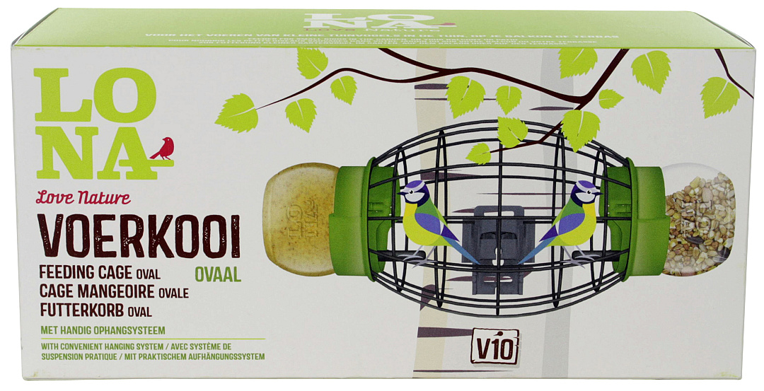 Lona V10 ovale voederkooi biedt de kleine tuinvogels bescherming tegen hun natuurlijke vijanden zoals katten en de grotere vogels. Ze kunnen rustig en ongestoord foerageren. De twee voederunits bieden de mogelijkheid voor meerdere soorten voeders. Tuinvogels zoals mezen, vinken , mussen en soortgenoten vliegen de kooi in om zich te goed doen aan alle lekkere tuinvogelvoeders. Fantastisch om te zien!