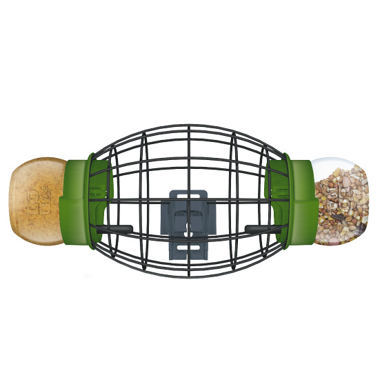 Ovale voederkooi met twee voederunits, voor kleine tuinvogels. Biedt bescherming tegen natuurlijke vijanden.