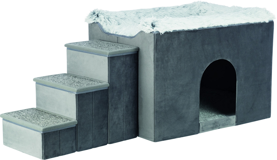 Slaap- en schuilplaats met trap om makkelijker het ligplateau te bereiken. Met uitneembare, wasbare kussens. Inklapbaar en compact op te bergen.