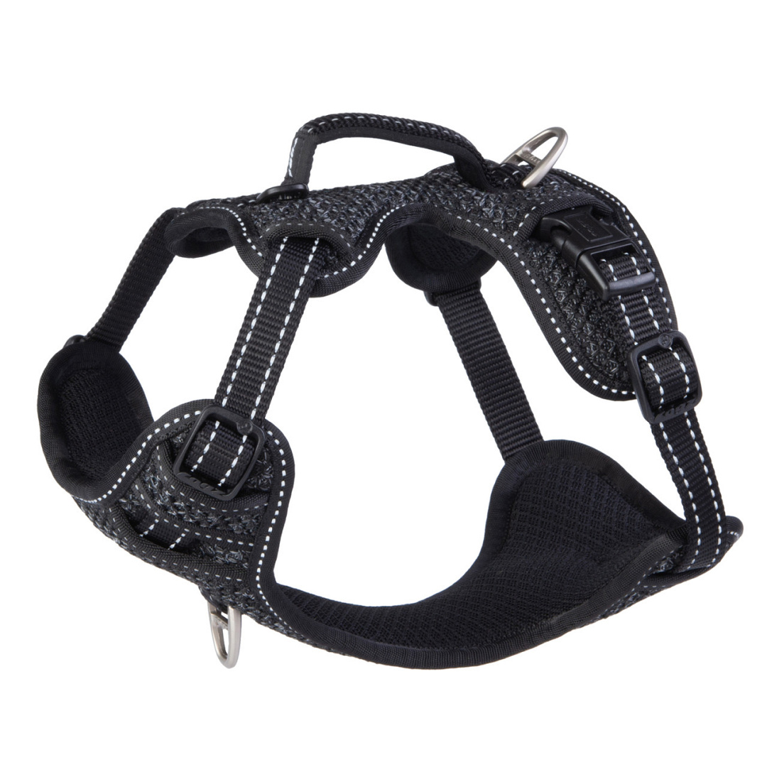 Hondentuig met een gevoerde borst en rugplaat voor extra ondersteuning. Met support handvat voor het ondersteunen bij obstakels.