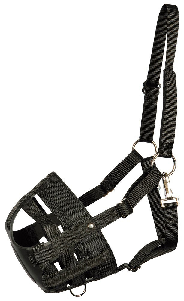 Graasmasker waarmee het paard minder gras kan eten, maar wel gewoon kan drinken en eten.