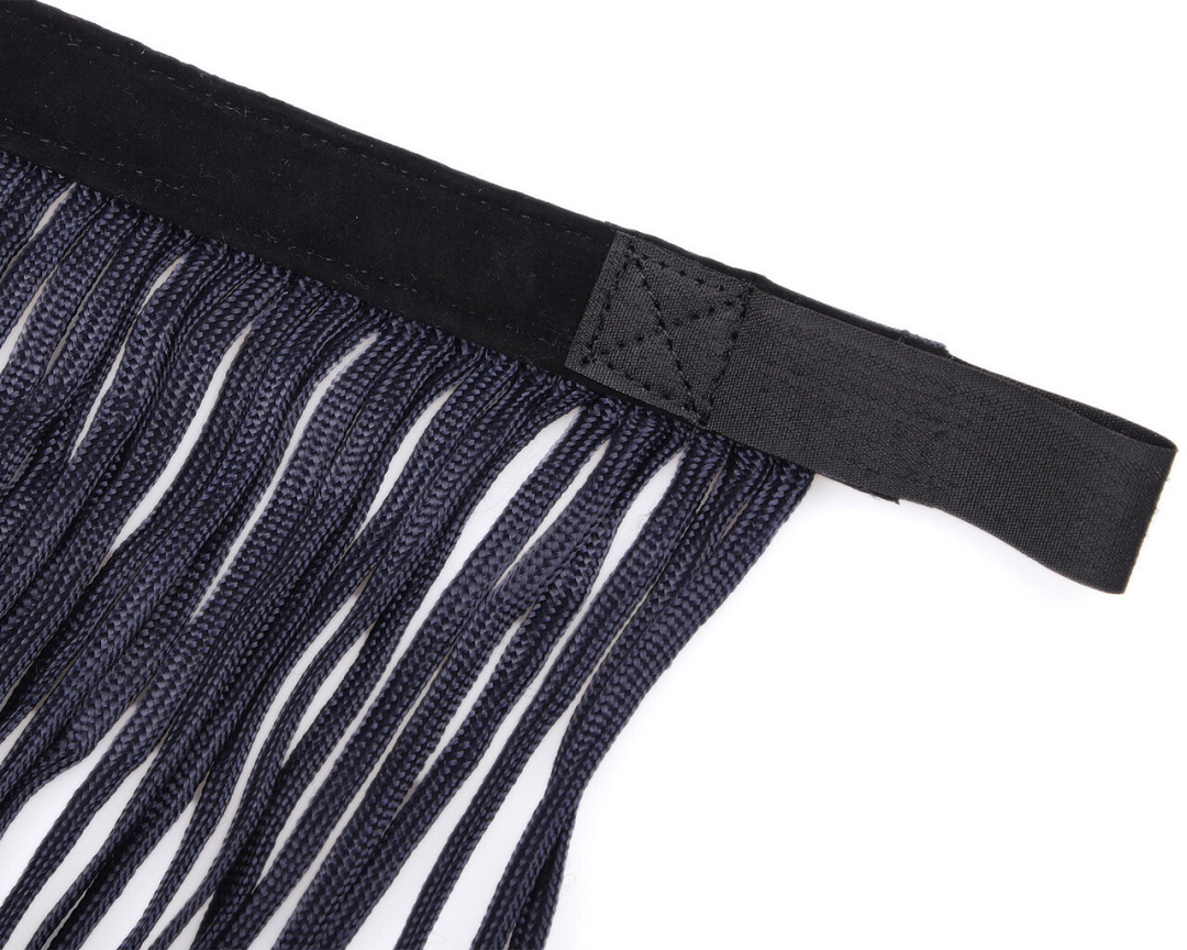 Deze vliegenfrontriem is voorzien van een opvallend patroon en koorden in twee kleuren.