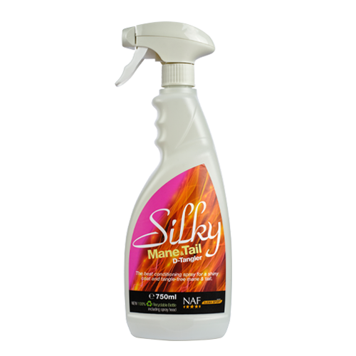 NAF Silky Mane & Tail D-Tangler laat een niet-vette, niet-plakkerige, natuurlijke glans achter die geen stof zal aantrekken en zorgt dat modder gemakkelijk uit het haar geborsteld kan worden.